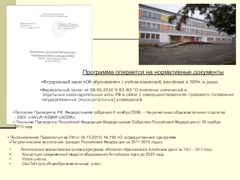 Послание Президента РФ Федеральному собранию 5 ноября 2008г. - Национальная образовательная стратегия - 2020 «НАША НОВАЯ ШКОЛА»;