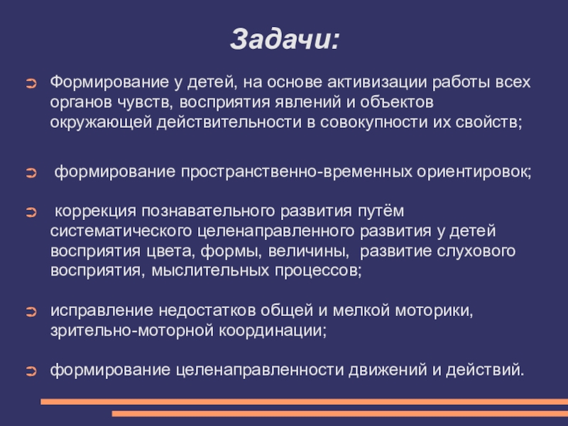 коррекция познавательного развития путём систематического целенаправленного развития у детей восприятия цвета, формы, величины, развитие слухового восприятия, мыслительных процессов;
