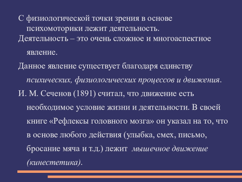 И. М. Сеченов (1891) считал, что движение есть необходимое условие жизни и деятельности. В своей книге «Рефлексы головного мозга» он указал на то, что в основе любого действия (улыбка, смех, письмо, бросание мяча и т.д.) лежит мышечное движение (кинестетика).