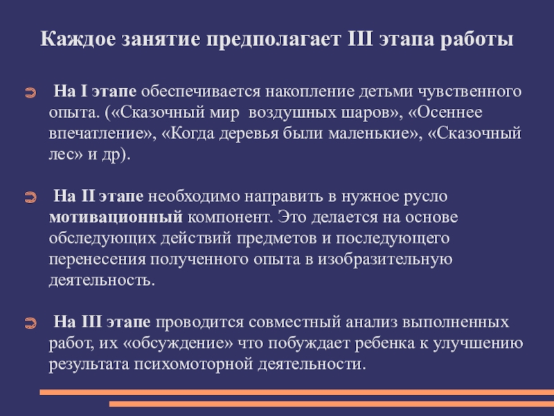 Слайд 8Каждое занятие предполагает III этапа работы