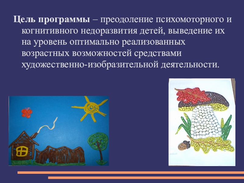 Слайд 2Цель программы – преодоление психомоторного и когнитивного недоразвития детей, выведение их
