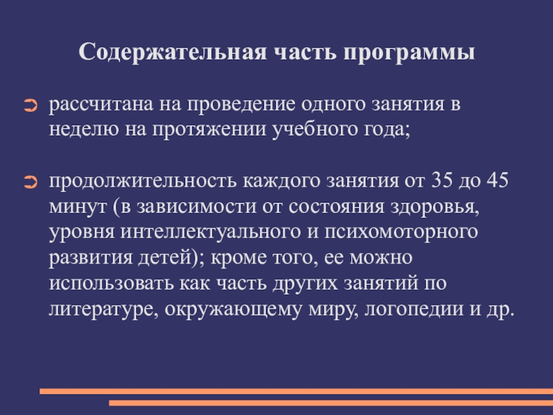 продолжительность каждого занятия от 35 до 45 минут (в зависимости от состояния здоровья, уровня интеллектуального и психомоторного развития детей); кроме того, ее можно использовать как часть других занятий по литературе, окружающему миру, логопедии и др.
