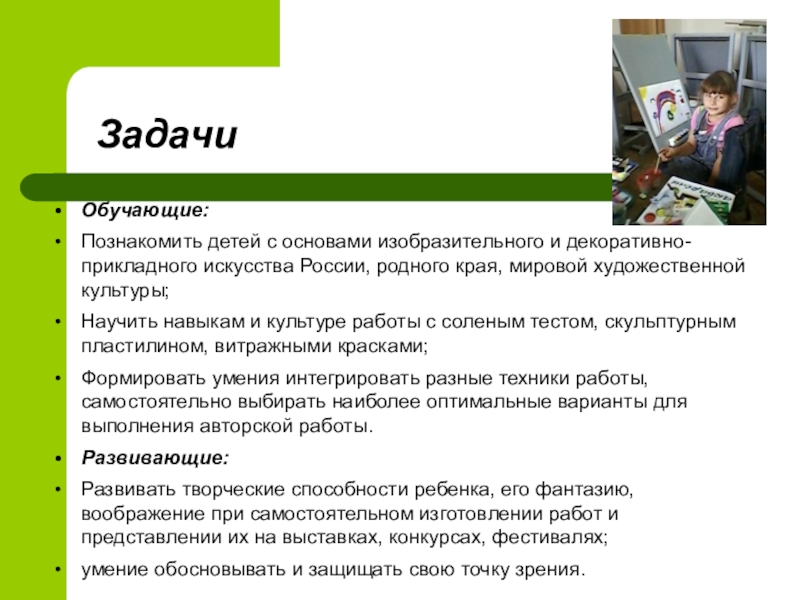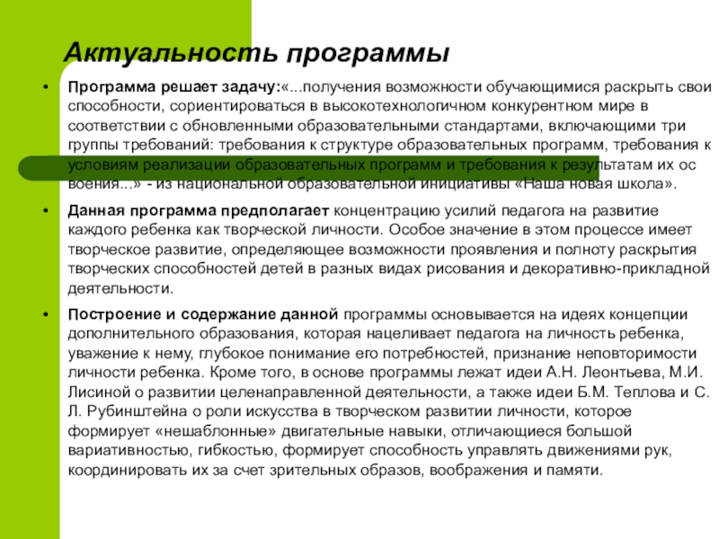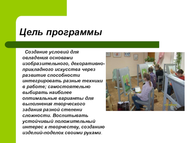 Данная программа предполагает концентрацию усилий педагога на развитие каждого ребенка как творческой личности. Особое значение в этом процессе имеет творческое развитие, определяющее возможности проявления и полноту раскрытия творческих способностей детей в разных видах рисования и декоративно-прикладной деятельности.