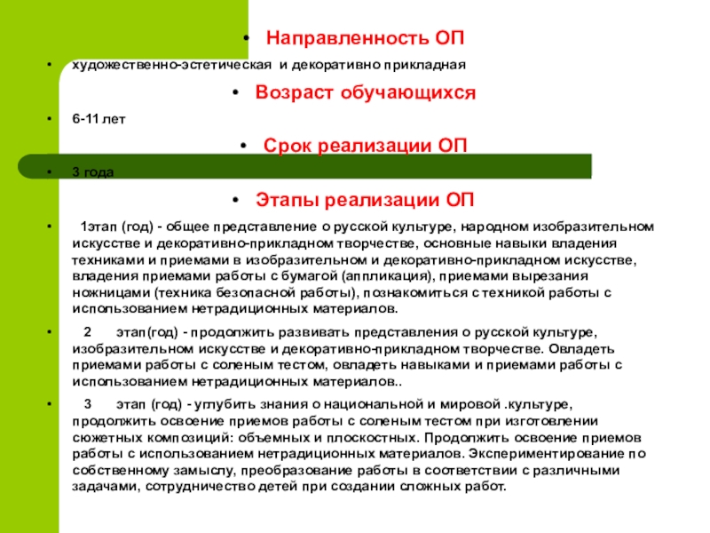 1этап (год) - общее представление о русской культуре, народном изобразительном искусстве и декоративно-прикладном творчестве, основные навыки владения техниками и приемами в изобразительном и декоративно-прикладном искусстве, владения приемами работы с бумагой (аппликация), приемами вырезания ножницами (техника безопасной работы), познакомиться с техникой работы с использованием нетрадиционных материалов.