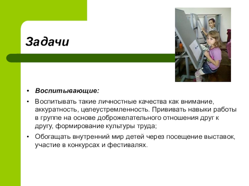 Развивать творческие способности ребенка, его фантазию, воображение при самостоятельном изготовлении работ и представлении их на выставках, конкурсах, фестивалях;