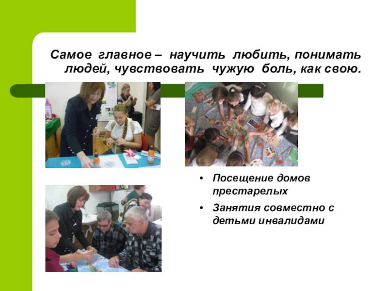 Слайд 13Самое главное – научить любить, понимать людей, чувствовать чужую боль, как