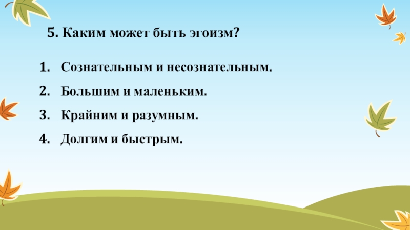 5. Каким может быть эгоизм?Сознательным и несознательным.Большим и маленьким.Крайним и разумным.Долгим и быстрым.