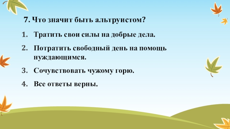 7. Что значит быть альтруистом?Тратить свои силы на добрые дела.Потратить свободный день на помощь нуждающимся.Сочувствовать чужому горю.Все