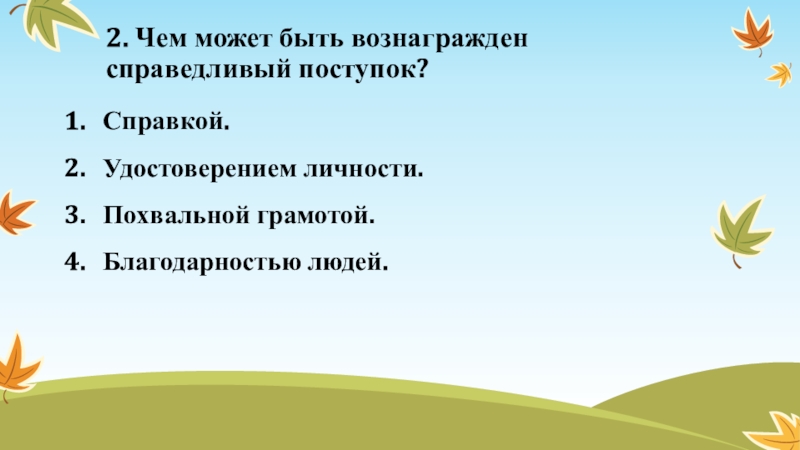Справкой.Удостоверением личности.Похвальной грамотой.Благодарностью людей.2. Чем может быть вознагражден справедливый поступок?