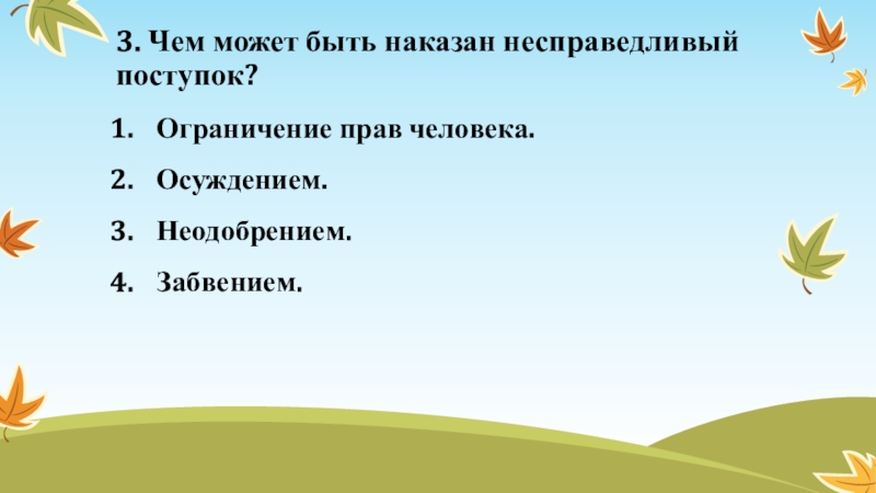 3. Чем может быть наказан несправедливый поступок?Ограничение прав человека.Осуждением.Неодобрением.Забвением.