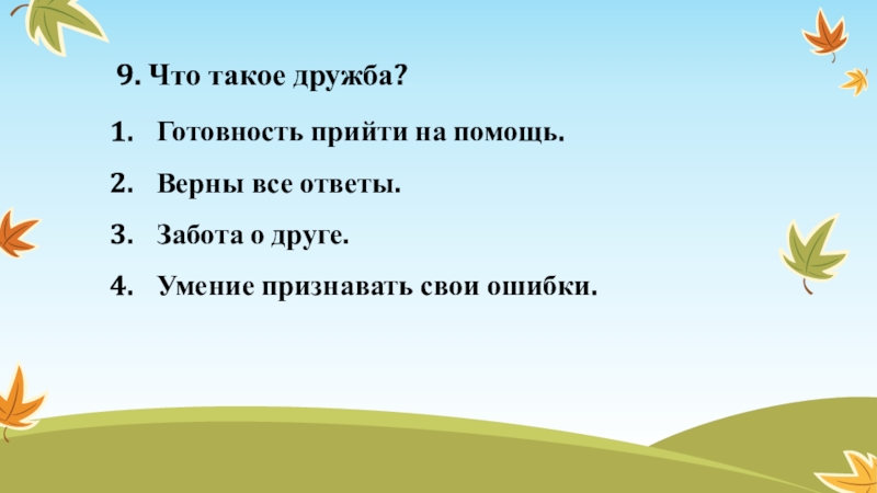 9. Что такое дружба?Готовность прийти на помощь.Верны все ответы.Забота о друге.Умение признавать свои ошибки.