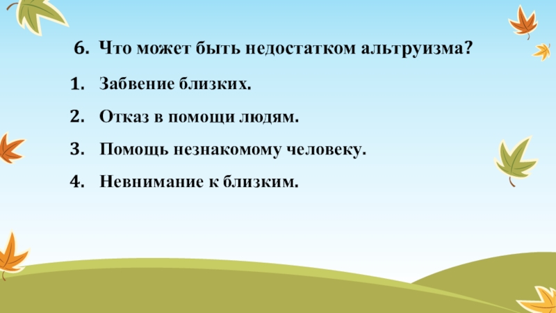 6. Что может быть недостатком альтруизма?Забвение близких.Отказ в помощи людям.Помощь незнакомому человеку.Невнимание к близким.