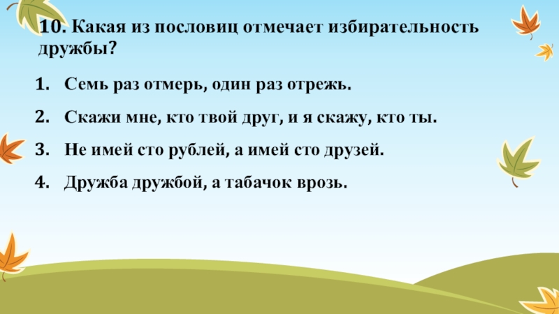Слайд 1210. Какая из пословиц отмечает избирательность дружбы?
