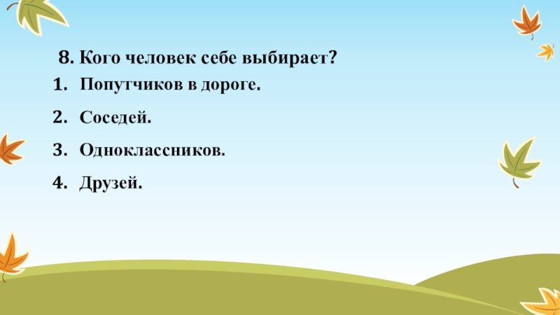 8. Кого человек себе выбирает?Попутчиков в дороге.Соседей.Одноклассников.Друзей.