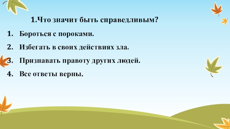 1.Что значит быть справедливым?Бороться с пороками.Избегать в своих действиях зла.Признавать правоту других людей.Все ответы верны.