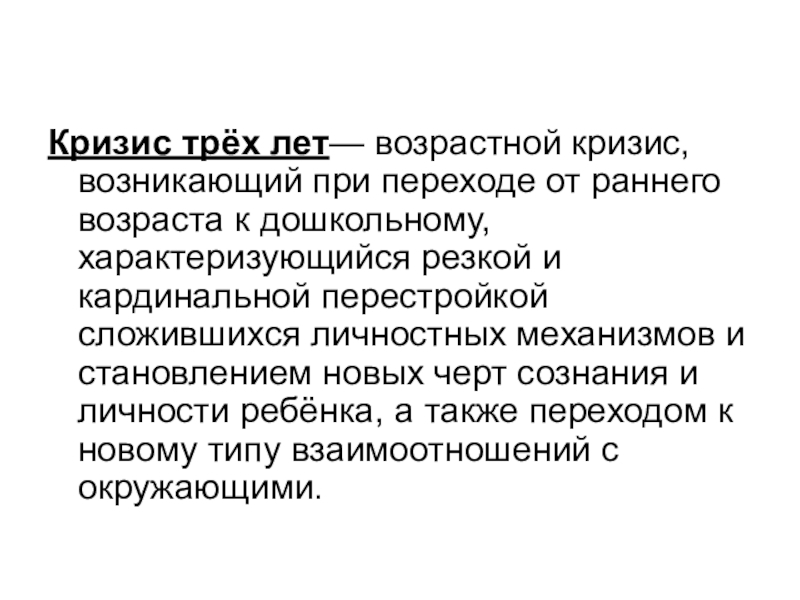 Слайд 2Кризис трёх лет— возрастной кризис, возникающий при переходе от раннего возраста