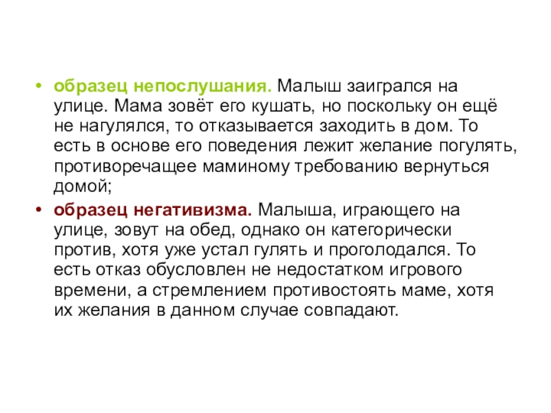 образец негативизма. Малыша, играющего на улице, зовут на обед, однако он категорически против, хотя уже устал гулять и проголодался. То есть отказ обусловлен не недостатком игрового времени, а стремлением противостоять маме, хотя их желания в данном случае совпадают.