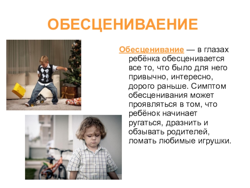 него привычно, интересно, дорого раньше. Симптом обесценивания может проявляться в том, что ребёнок начинает ругаться, дразнить и обзывать родителей, ломать любимые игрушки.