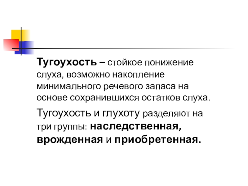 Тугоухость и глухоту разделяют на три группы: наследственная, врожденная и приобретенная.
