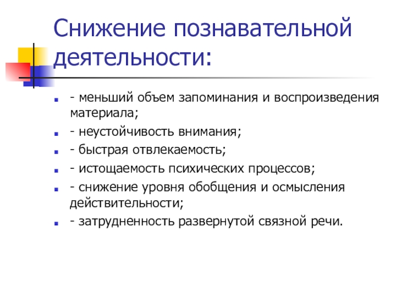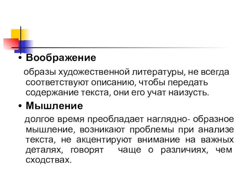 долгое время преобладает наглядно- образное мышление, возникают проблемы при анализе текста, не акцентируют внимание на важных деталях, говорят чаще о различиях, чем сходствах.