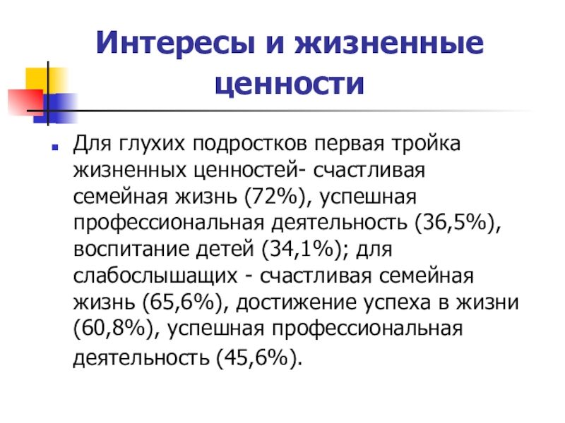 счастливая семейная жизнь (72%), успешная профессиональная деятельность (36,5%), воспитание детей (34,1%); для слабослышащих - счастливая семейная жизнь (65,6%), достижение успеха в жизни (60,8%), успешная профессиональная деятельность (45,6%).