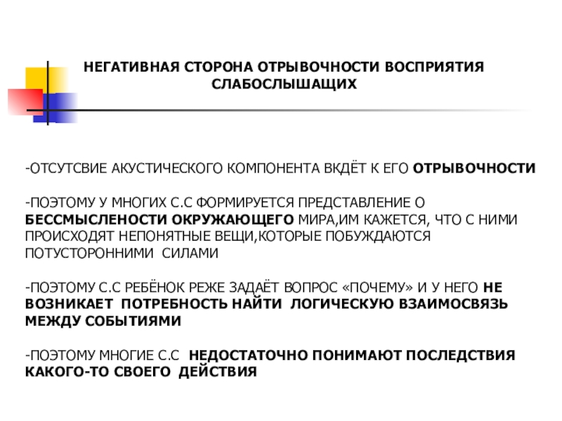 Слайд 8НЕГАТИВНАЯ СТОРОНА ОТРЫВОЧНОСТИ ВОСПРИЯТИЯ СЛАБОСЛЫШАЩИХ