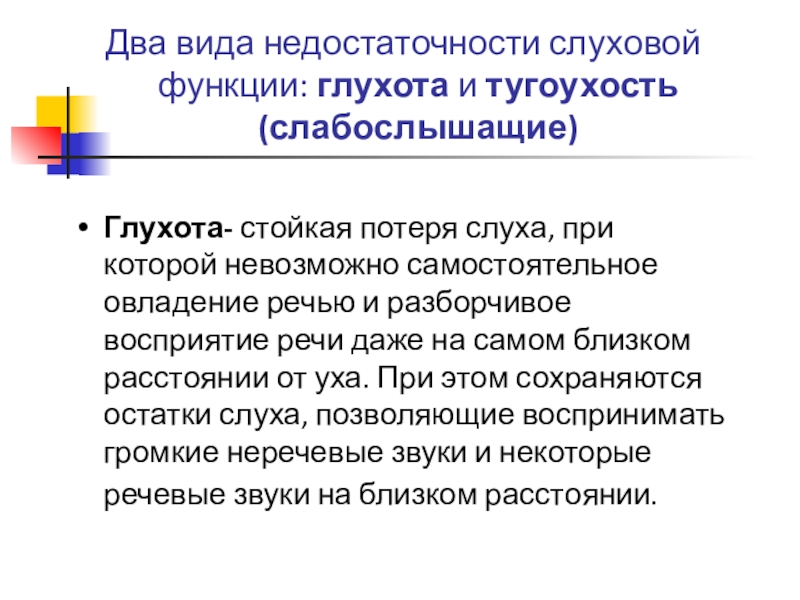Два вида недостаточности слуховой функции: глухота и тугоухость (слабослышащие)