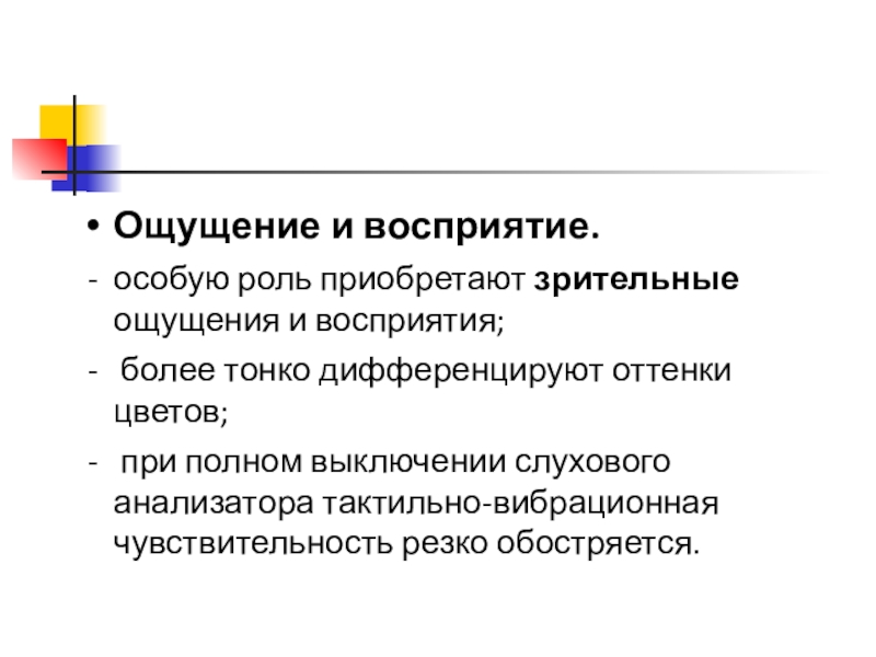 при полном выключении слухового анализатора тактильно-вибрационная чувствительность резко обостряется.