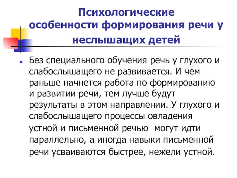Слайд 1«ПСИХОЛОГИЧЕСКИЕ ОСОБЕННОСТИ РАЗВИТИЯ ДЕТЕЙ С НАРУШЕНИЯМИ СЛУХА»