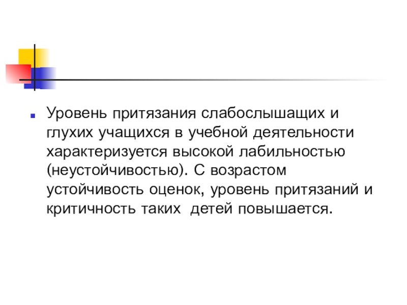Слайд 15Уровень притязания слабослышащих и глухих учащихся в учебной деятельности характеризуется высокой