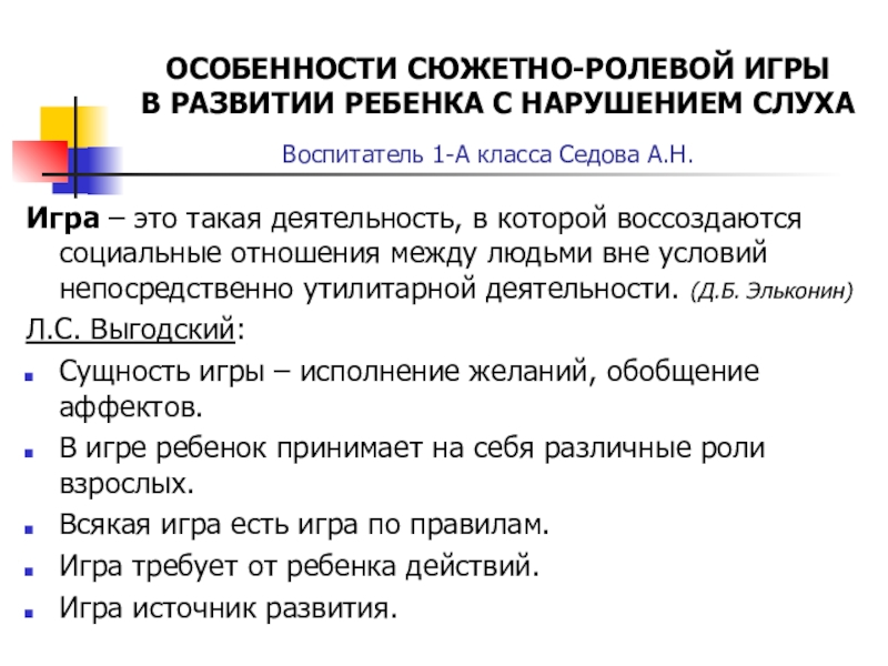 Седова А.Н. «Особенности сюжетно-ролевой игры детей с нарушениями слуха и речи»