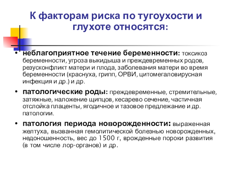 патология периода новорожденности: выраженная желтуха, вызванная гемолитической болезнью новорожденных, недоношенность, вес до 1500 г, врожденные пороки развития (в том числе лор-органов) и др.