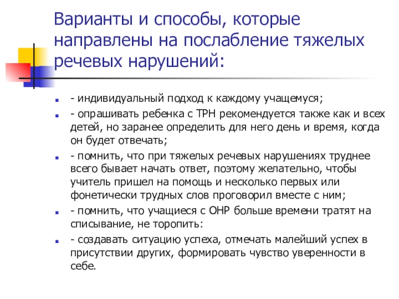 Слайд 39Варианты и способы, которые направлены на послабление тяжелых речевых нарушений: