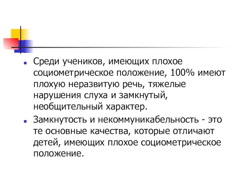 Слайд 23Среди учеников, имеющих плохое социометрическое положение, 100% имеют плохую неразвитую речь,
