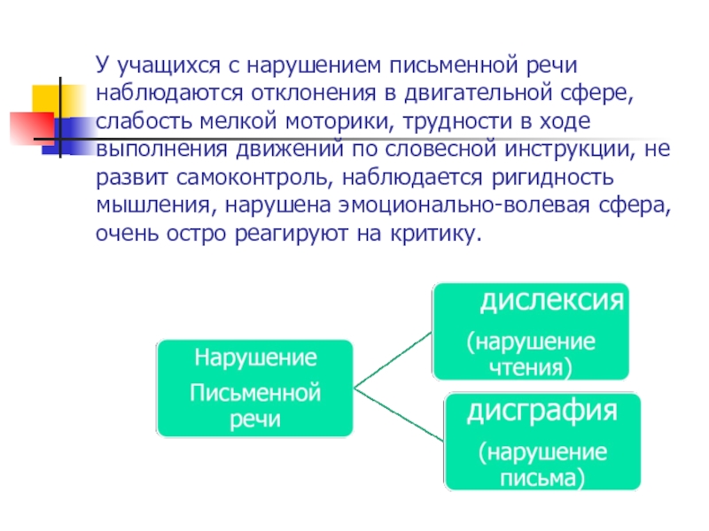 Слайд 40У учащихся с нарушением письменной речи наблюдаются отклонения в двигательной сфере,