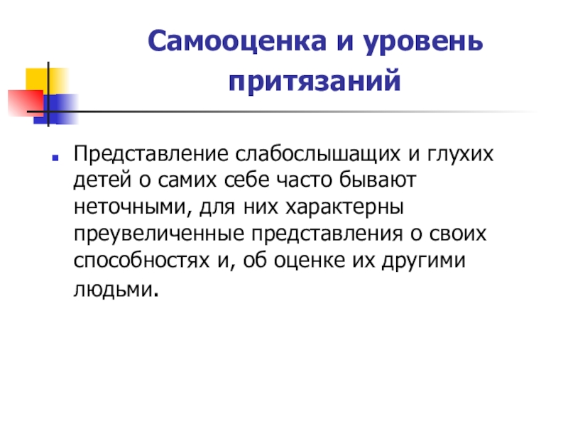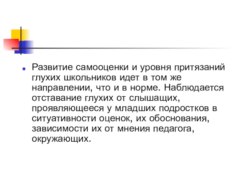 Слайд 17Развитие самооценки и уровня притязаний глухих школьников идет в том же