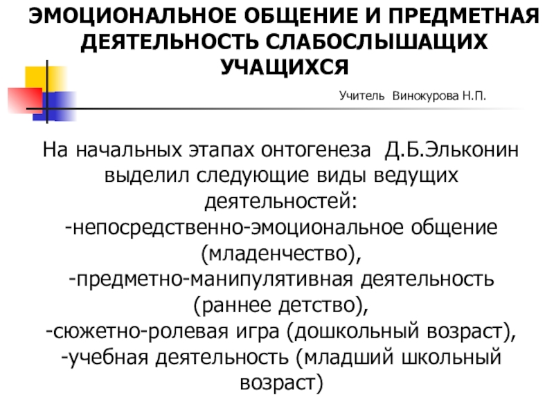 Винокурова Н.П. «Эмоциональное общение и предметная деятельность слабослышащих учащихся»