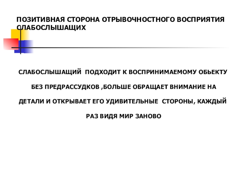 Слайд 9ПОЗИТИВНАЯ СТОРОНА ОТРЫВОЧНОСТНОГО ВОСПРИЯТИЯ СЛАБОСЛЫШАЩИХ