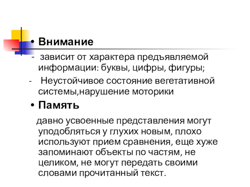 давно усвоенные представления могут уподобляться у глухих новым, плохо используют прием сравнения, еще хуже запоминают объекты по частям, не целиком, не могут передать своими словами прочитанный текст.