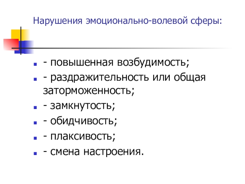 слабость мелкой моторики, трудности в ходе выполнения движений по словесной инструкции, не развит самоконтроль, наблюдается ригидность мышления, нарушена эмоционально-волевая сфера, очень остро реагируют на критику.