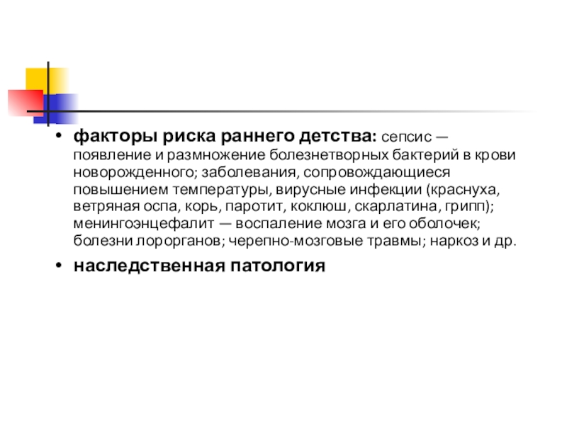 бактерий в крови новорожденного; заболевания, сопровождающиеся повышением температуры, вирусные инфекции (краснуха, ветряная оспа, корь, паротит, коклюш, скарлатина, грипп); менингоэнцефалит — воспаление мозга и его оболочек; болезни лорорганов; черепно-мозговые травмы; наркоз и др.
