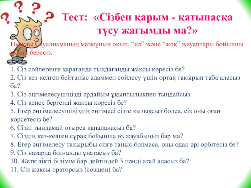Слайд 32Тест: «Сізбен қарым - қатынасқа түсу жағымды ма?»