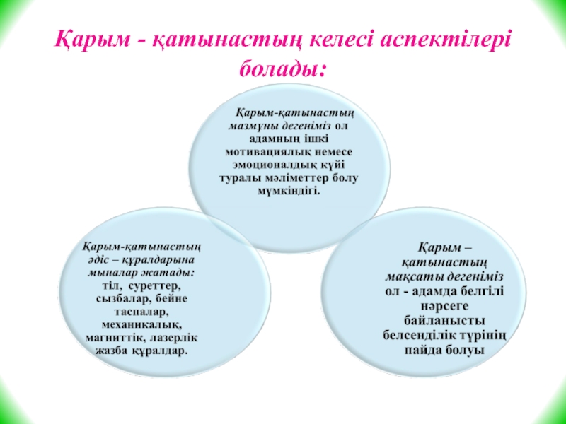 Слайд 11Қарым - қатынастың келесі аспектілері болады: