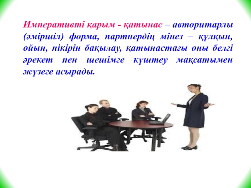 Слайд 16Императивті қарым - қатынас – авторитарлы (әміршіл) форма, партнердің мінез –