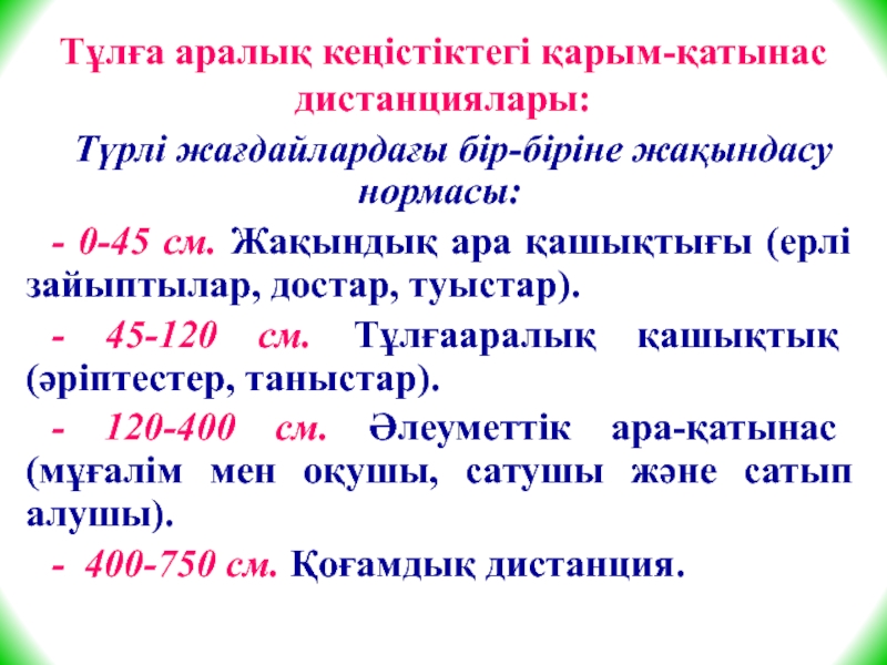 Слайд 24Тұлға аралық кеңістіктегі қарым-қатынас дистанциялары: