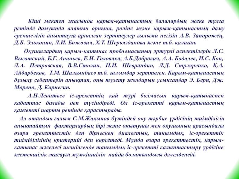 Слайд 10 Кіші мектеп жасында қарым-қатынастың балалардың жеке тұлға ретінде дамуында