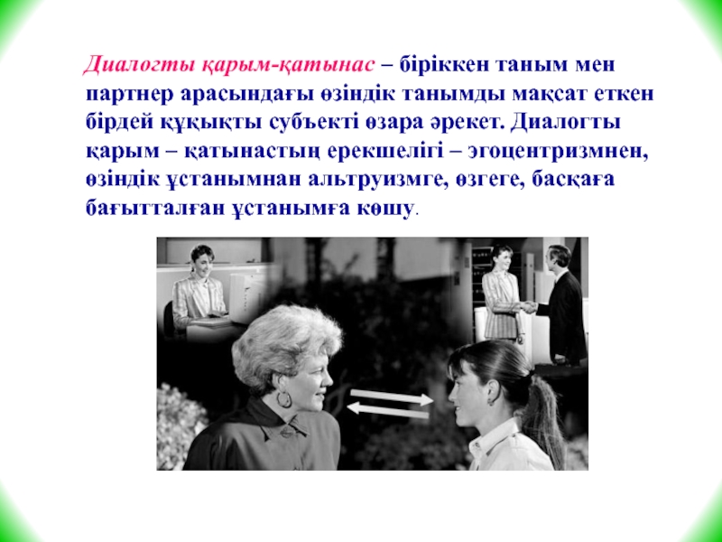 еткен бірдей құқықты субъекті өзара әрекет. Диалогты қарым – қатынастың ерекшелігі – эгоцентризмнен, өзіндік ұстанымнан альтруизмге, өзгеге, басқаға бағытталған ұстанымға көшу.