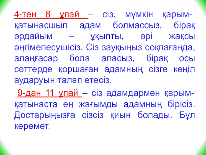 Слайд 344-тен 8 ұпай – сіз, мүмкін қарым- қатынасшыл адам болмассыз, бірақ
