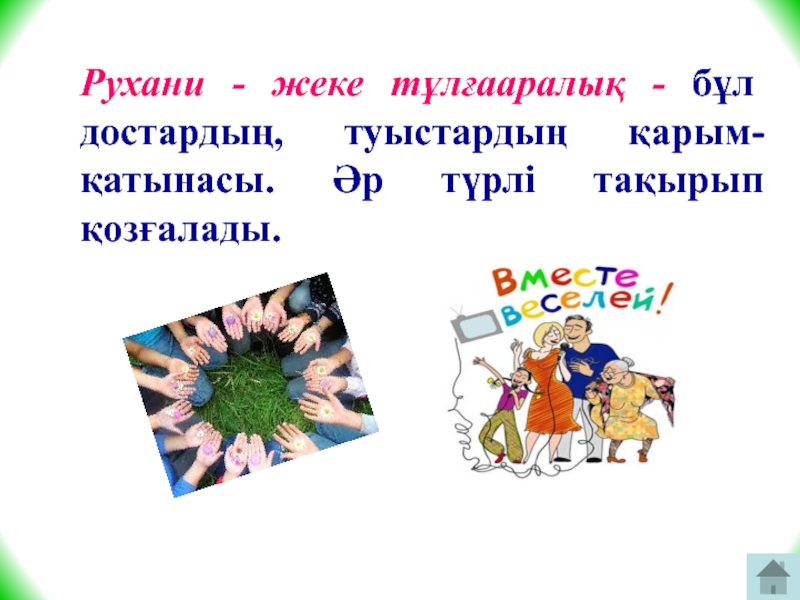Слайд 18Рухани - жеке тұлғааралық - бұл достардың, туыстардың қарым-қатынасы. Әр түрлі