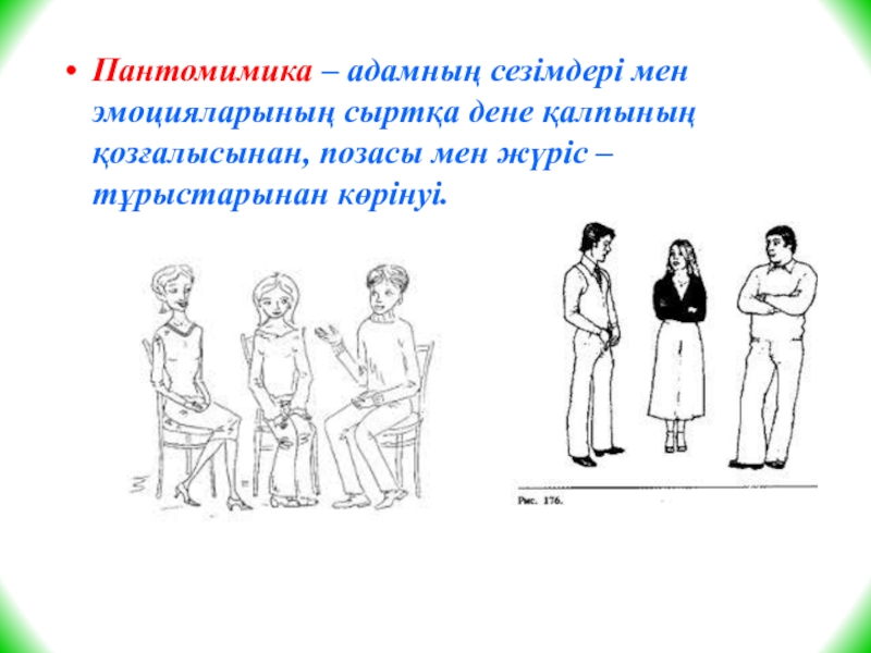 Слайд 23Пантомимика – адамның сезімдері мен эмоцияларының сыртқа дене қалпының қозғалысынан, позасы